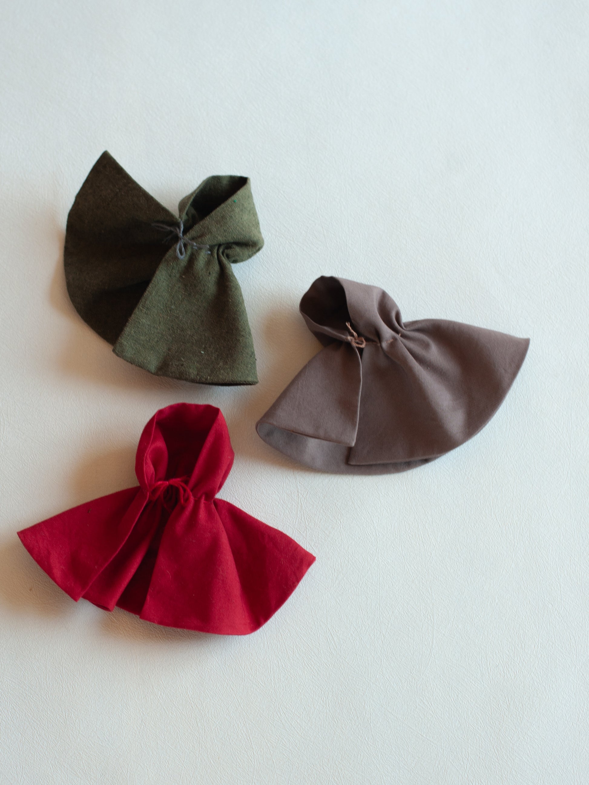 Pattern bundle includes: Patterns and instructions for: 6 hats, 2 boots, and a hooded cloak—all designed to fit the Mama Roar Sews Dollhouse Critter patterns. Critter patterns and other clothing patterns sold separately.